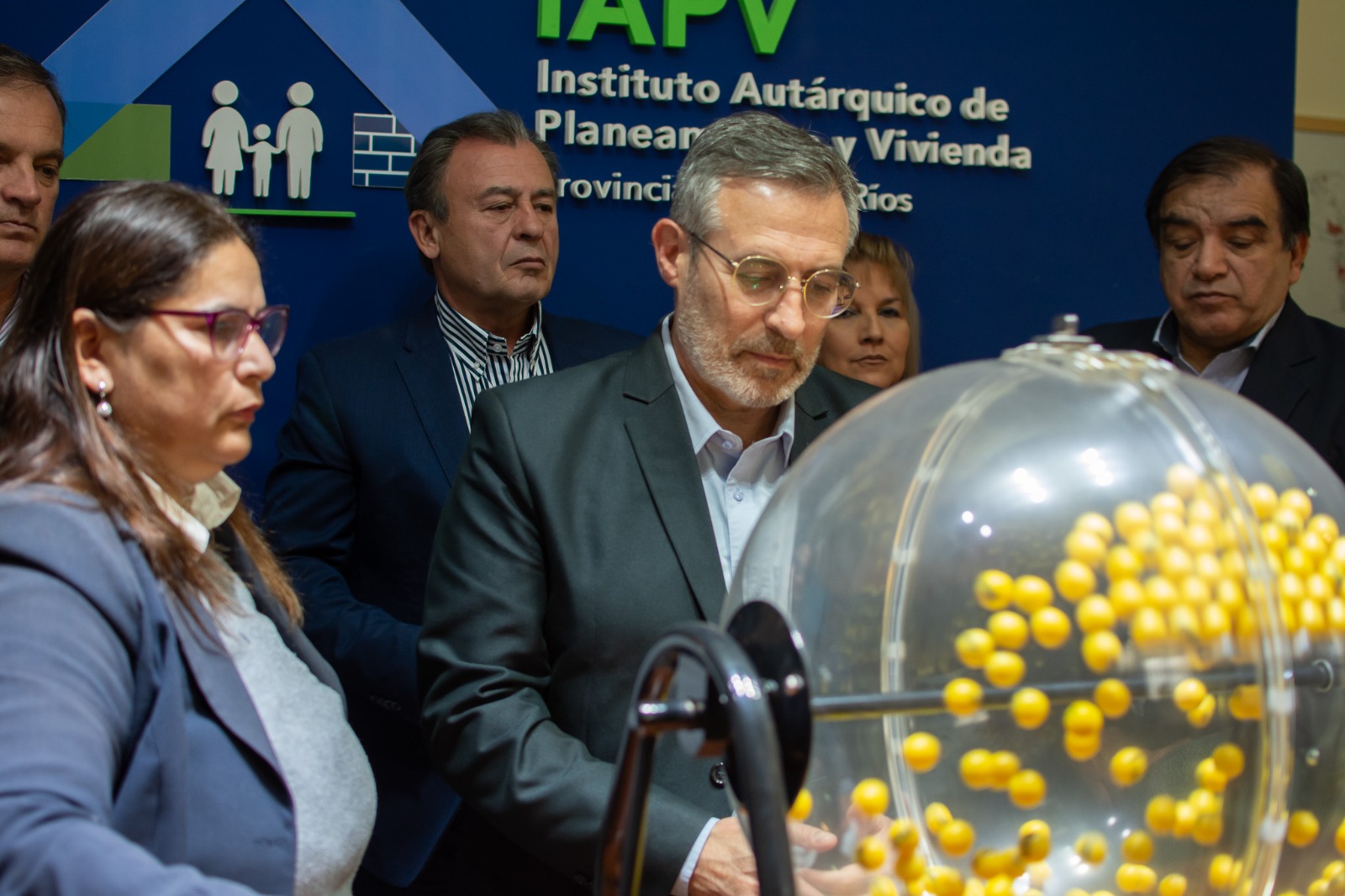 Este martes en la sede del IAPV en Paraná, con la presencia del Presidente del Instituto, Marcelo Bisogni, el Presidente Municipal, Lucas Larrarte, y el Senador Departamental, Marcelo Berthet, se realizó el sorteo de las primeras 26 viviendas del Programa Casa Propia que se está terminando en nuestra ciudad.